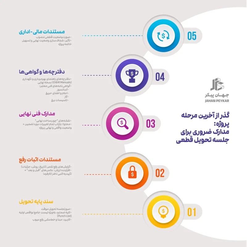 | سند کلیدی | صورتجلسه تحویل موقت و لیست نواقص (Punch List). | صورتجلسه تحویل قطعی و گواهی رفع نواقص. |
